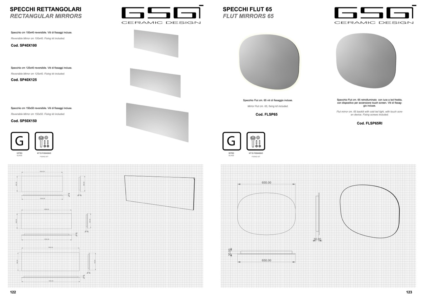 Reversible Mirror cm 125x40. Fixing kit included.