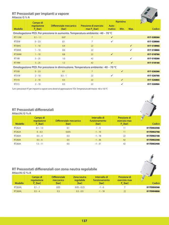 Tutti i pressostati RT per impianti a vapore sono dotati di approvazione TÜV. Temperatura del mezzo: -40 a 150 °C