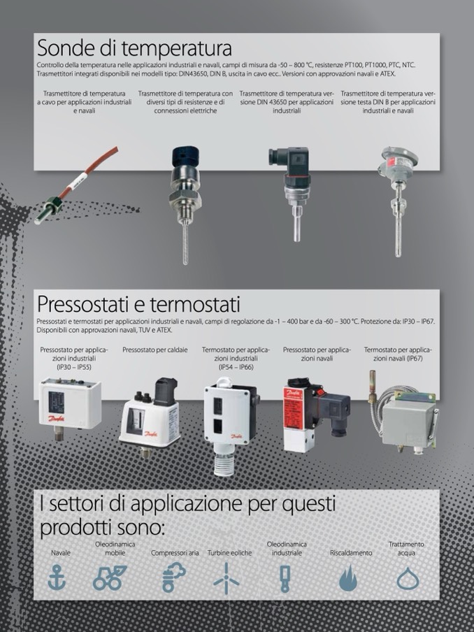 Pressostati e termostati per applicazioni industriali e navali, campi di regolazione da -1 – 400 bar e da -60 – 300 °C. Protezione da: IP30 – IP67.