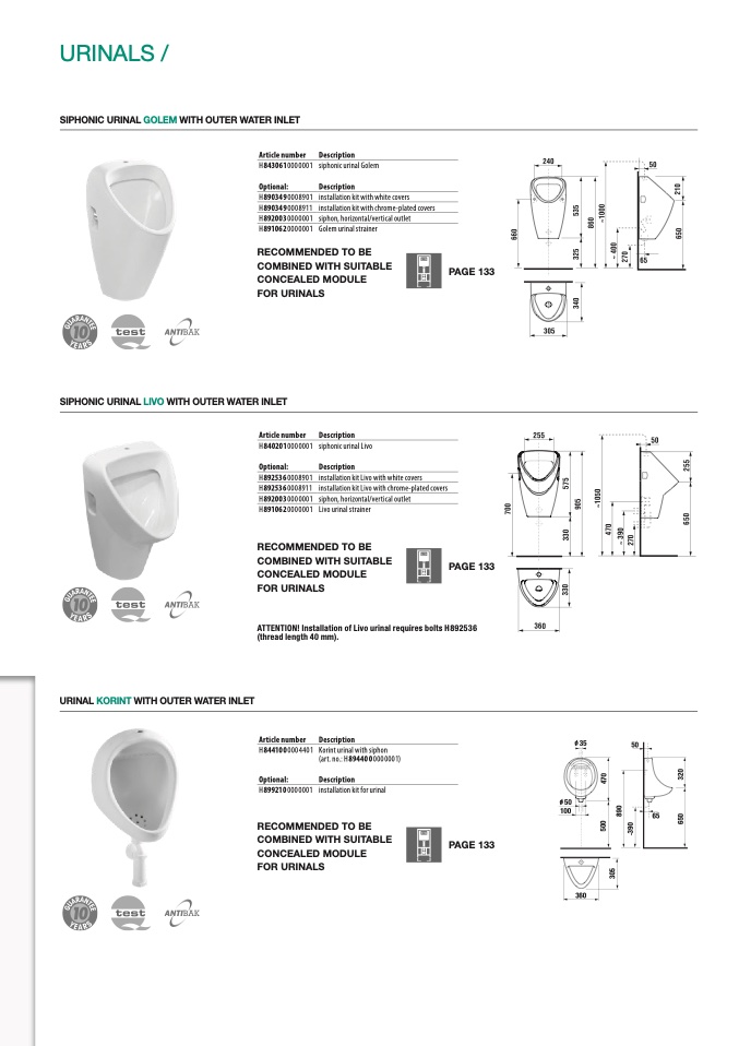 ATTENTION! Installation of Livo urinal requires bolts H892536