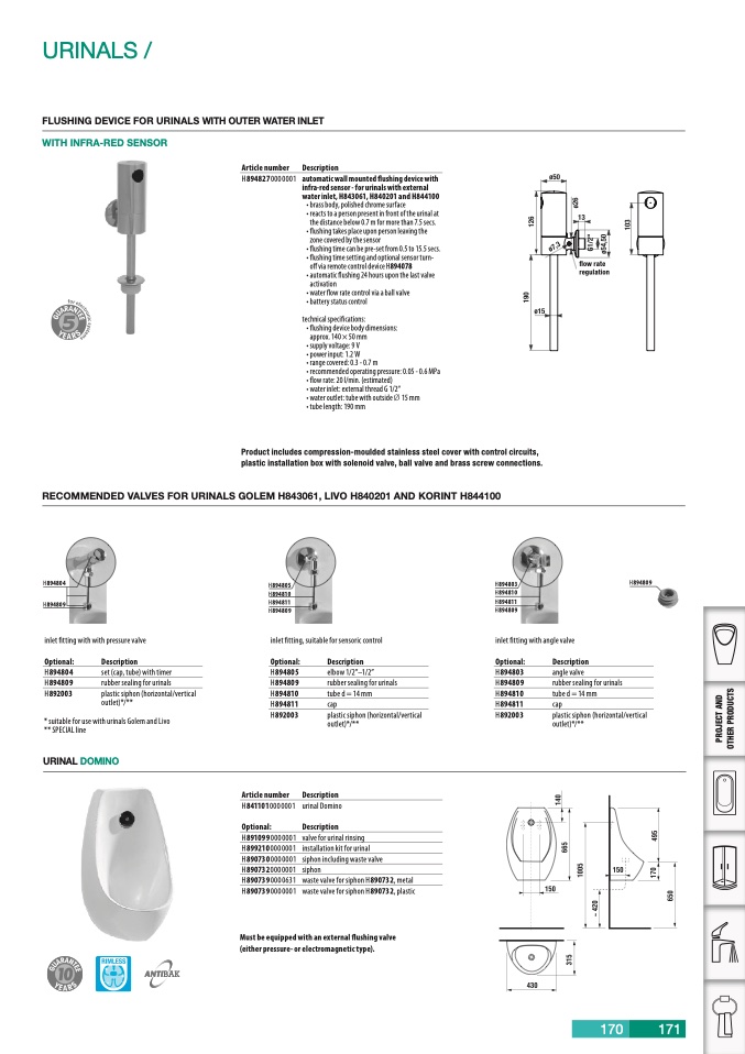 RECOMMENDED VALVES FOR URINALS GOLEM H843061, LIVO H840201 AND KORINT H844100