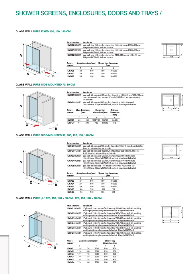 1300×800 mm and 300×900 mm, JIKA perla GLASS finish, incl. side moulding