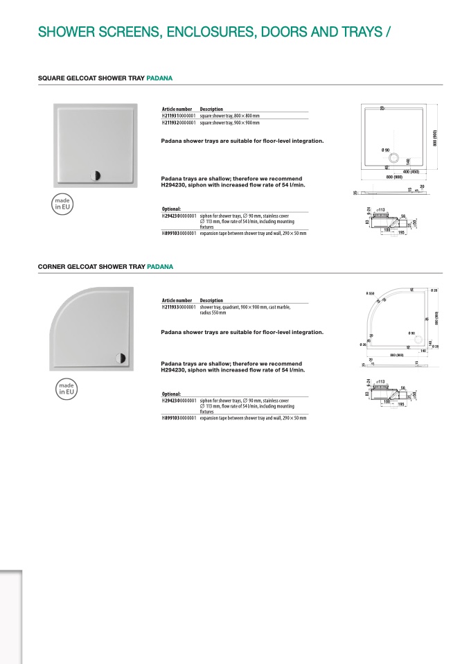 SQUARE GELCOAT SHOWER TRAY PADANA