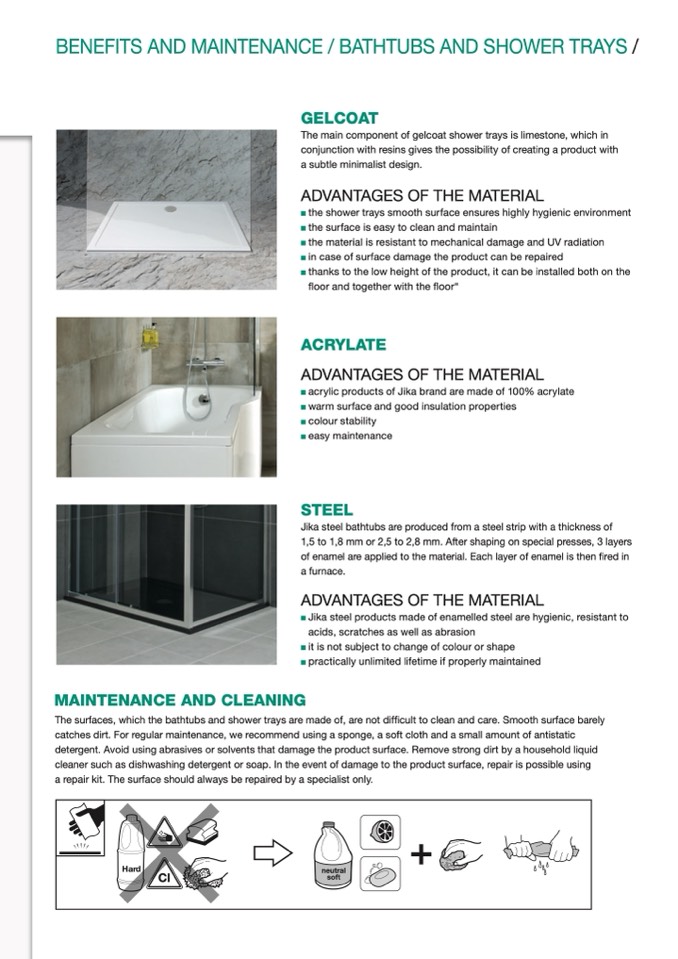 The surfaces, which the bathtubs and shower trays are made of, are not difficult to clean and care. Smooth surface barely
