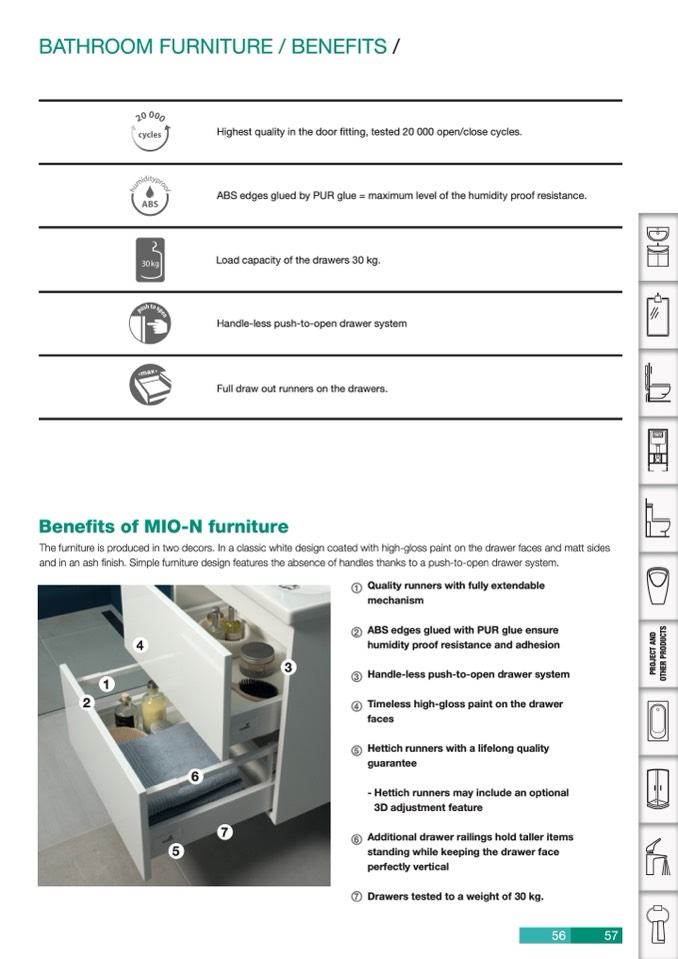 The furniture is produced in two decors. In a classic white design coated with high-gloss paint on the drawer faces and matt sides