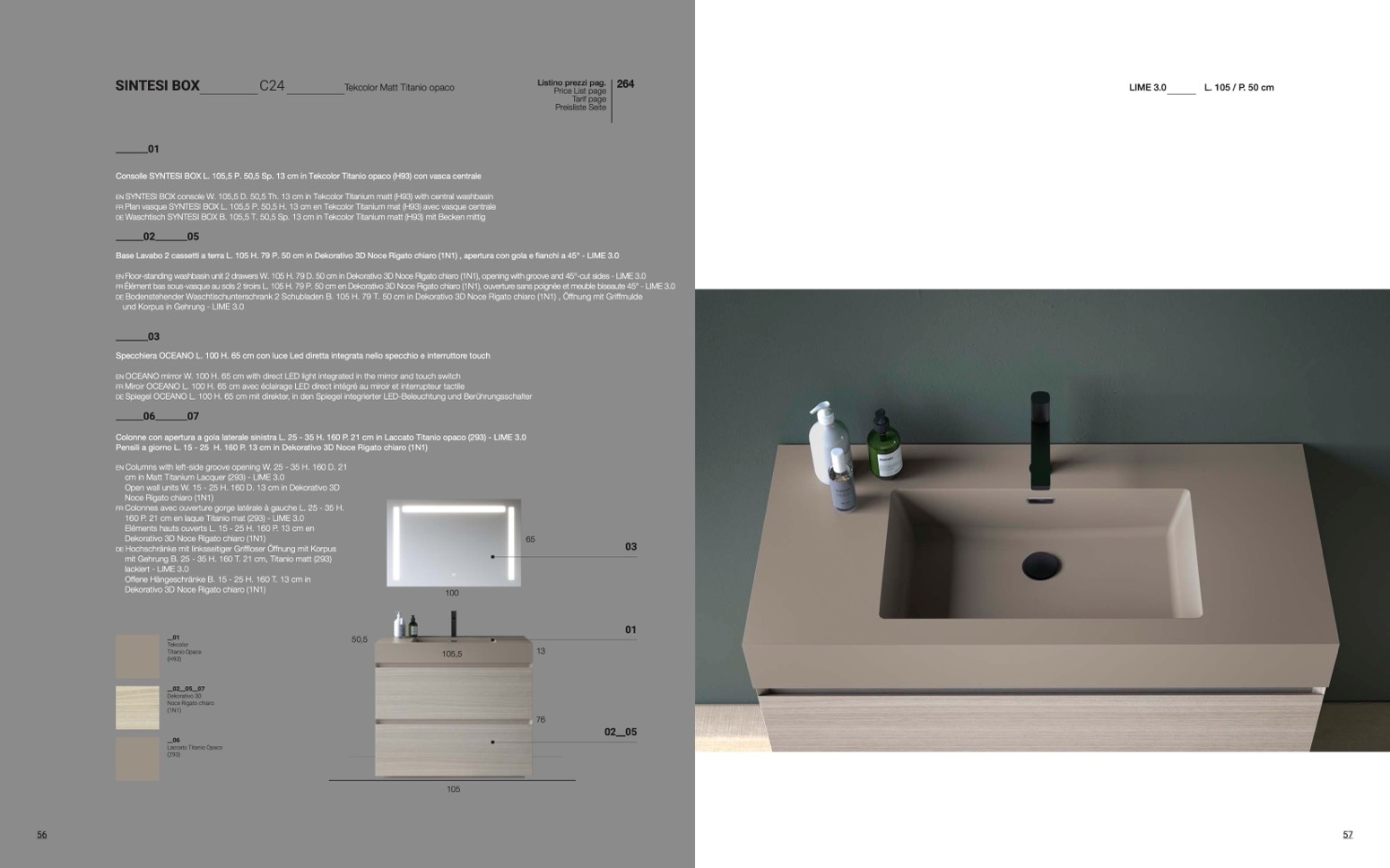SYNTESI BOX console W. 105,5 D. 50,5 Th. 13 cm in Tekcolor Titanium matt (H93) with central washbasin