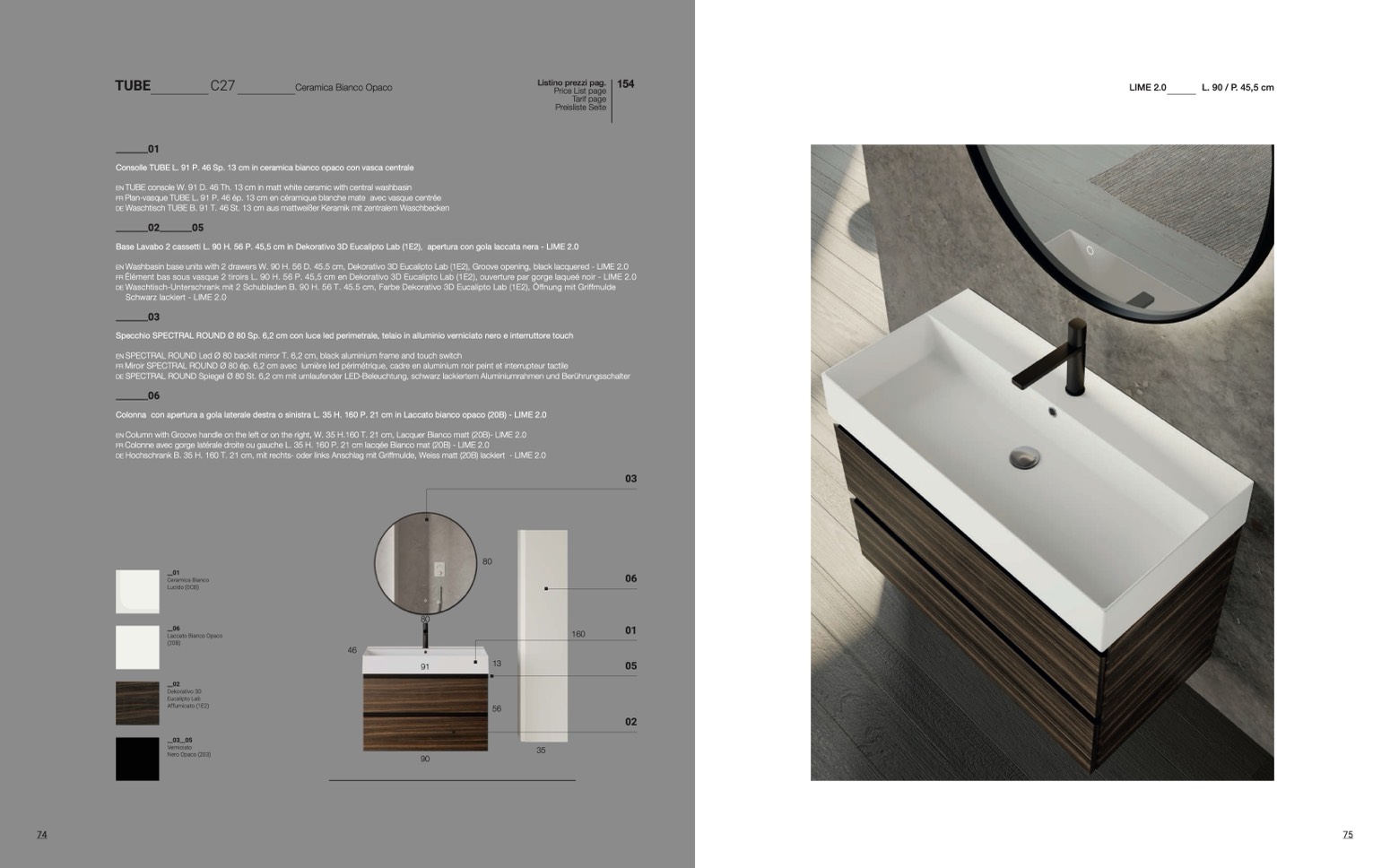 Base Lavabo 2 cassetti L. 90 H. 56 P. 45,5 cm in Dekorativo 3D Eucalipto Lab (1E2), apertura con gola laccata nera - LIME 2.0