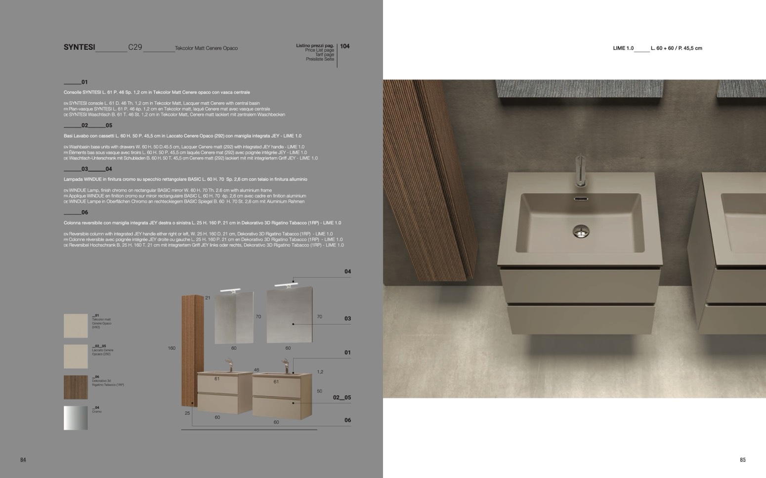 Washbasin base units with drawers W. 60 H. 50 D.45.5 cm, Lacquer Cenere matt (292) with integrated JEY handle - LIME 1.0