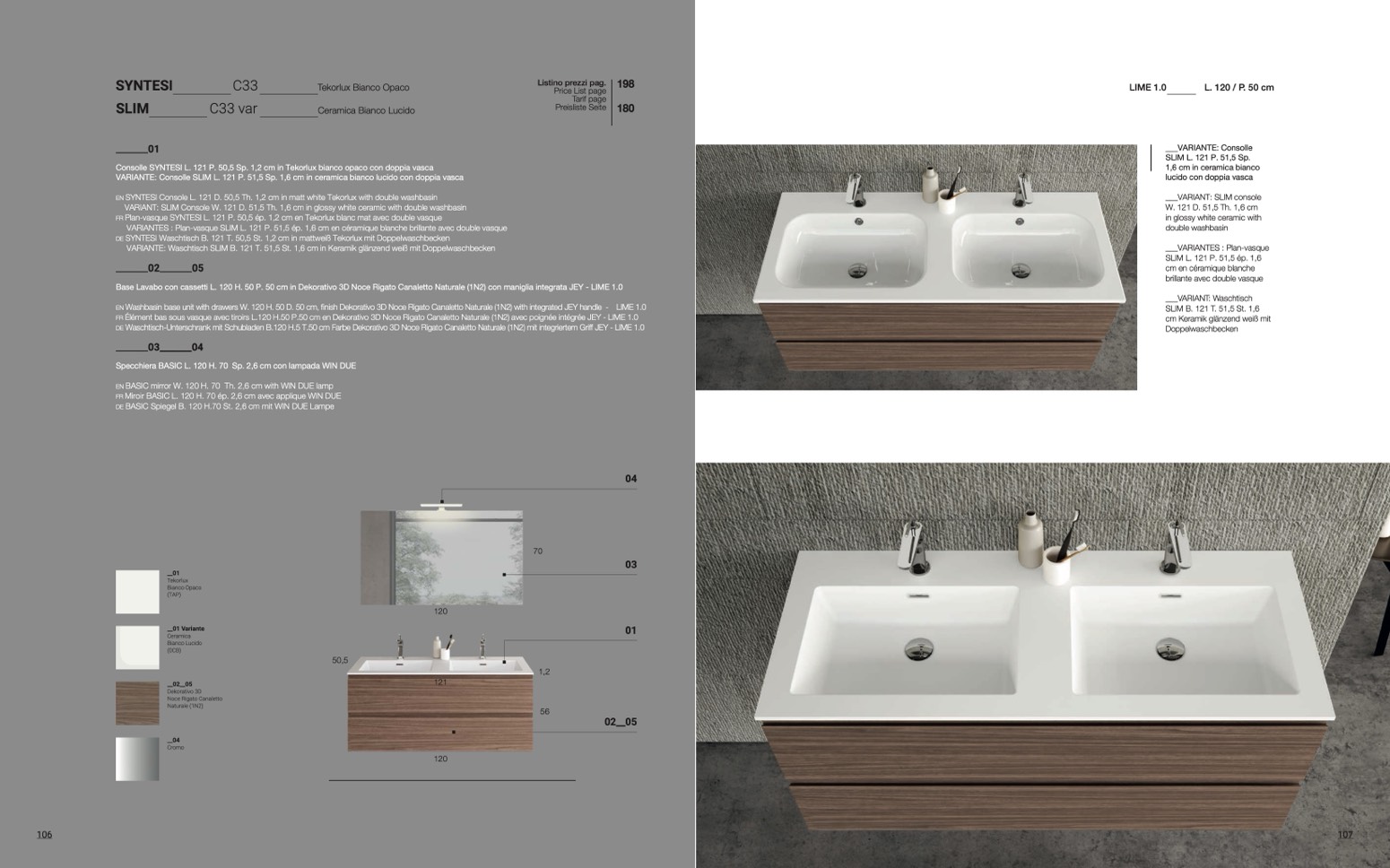 Washbasin base unit with drawers W. 120 H. 50 D. 50 cm, finish Dekorativo 3D Noce Rigato Canaletto Naturale (1N2) with integrated JEY handle - LIME 1.0