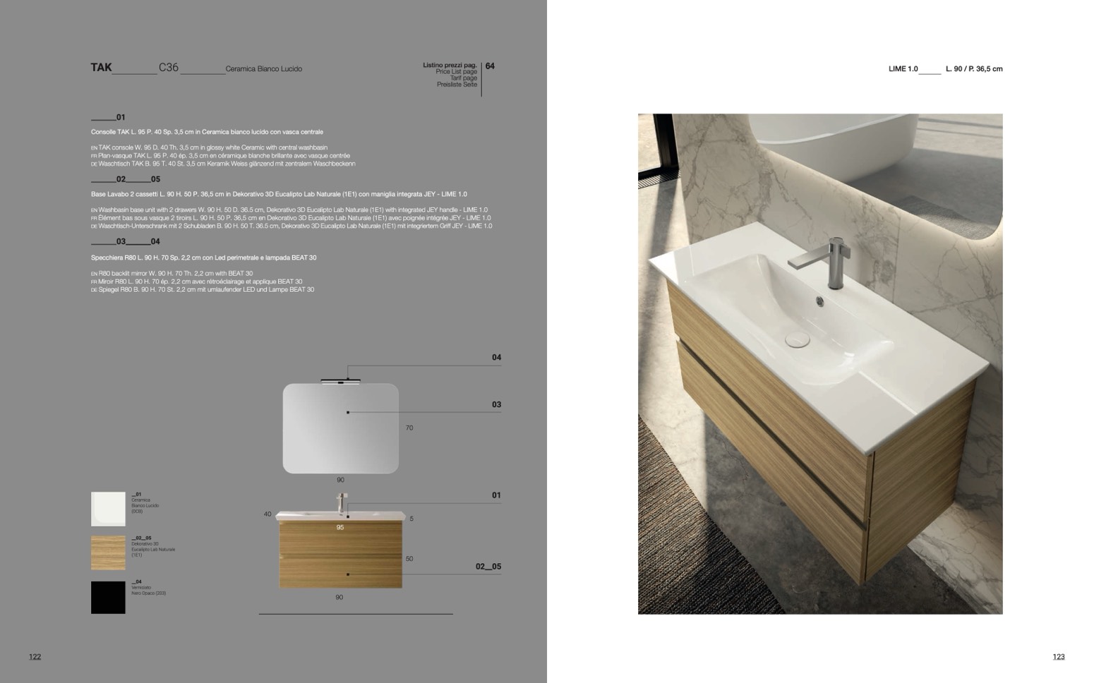 Base Lavabo 2 cassetti L. 90 H. 50 P. 36,5 cm in Dekorativo 3D Eucalipto Lab Naturale (1E1) con maniglia integrata JEY - LIME 1.0