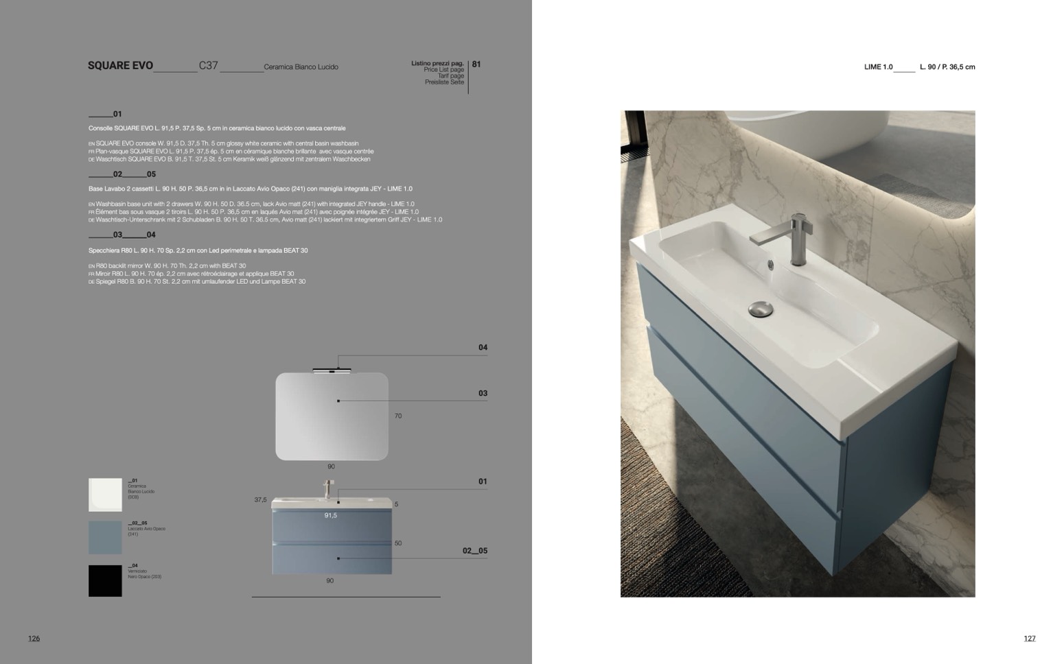 Washbasin base unit with 2 drawers W. 90 H. 50 D. 36.5 cm, lack Avio matt (241) with integrated JEY handle - LIME 1.0
