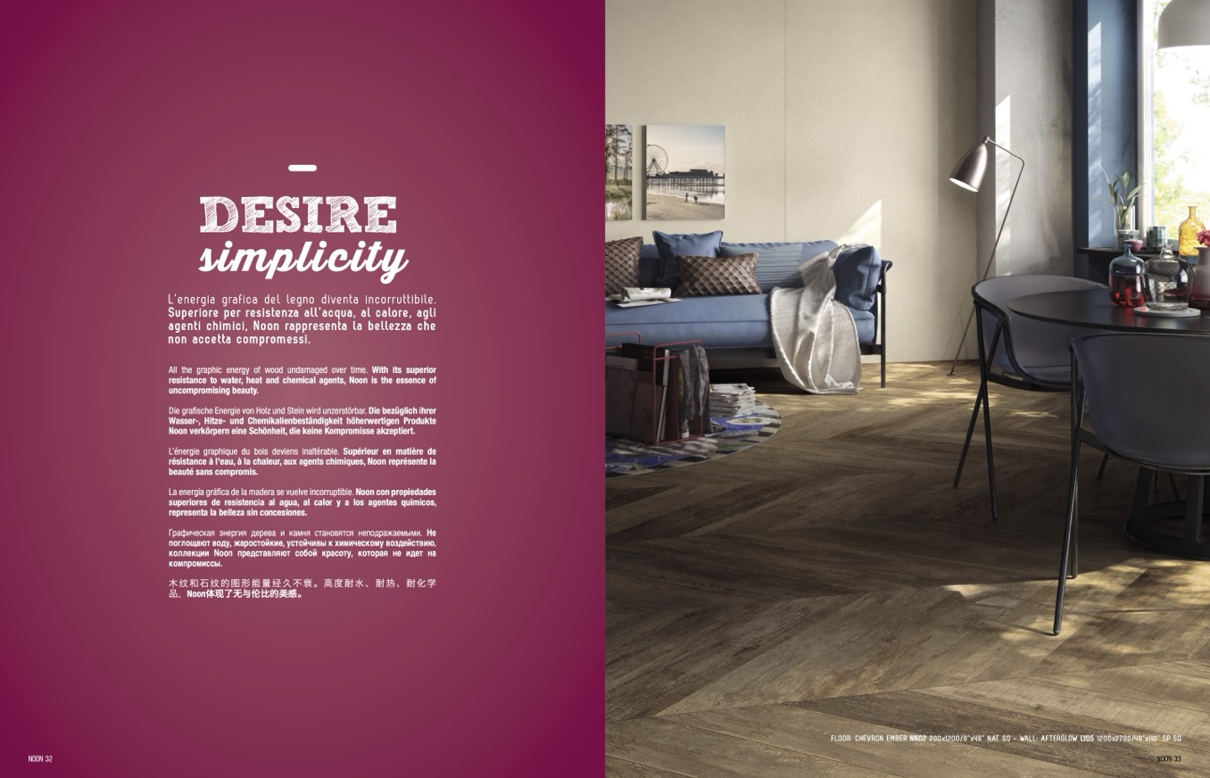 FLOOR: CHEVRON EMBER NN02 200x1200/8”x48” NAT SQ - WALL: AFTERGLOW LY05 1200x2780/48”x110” SP SQ