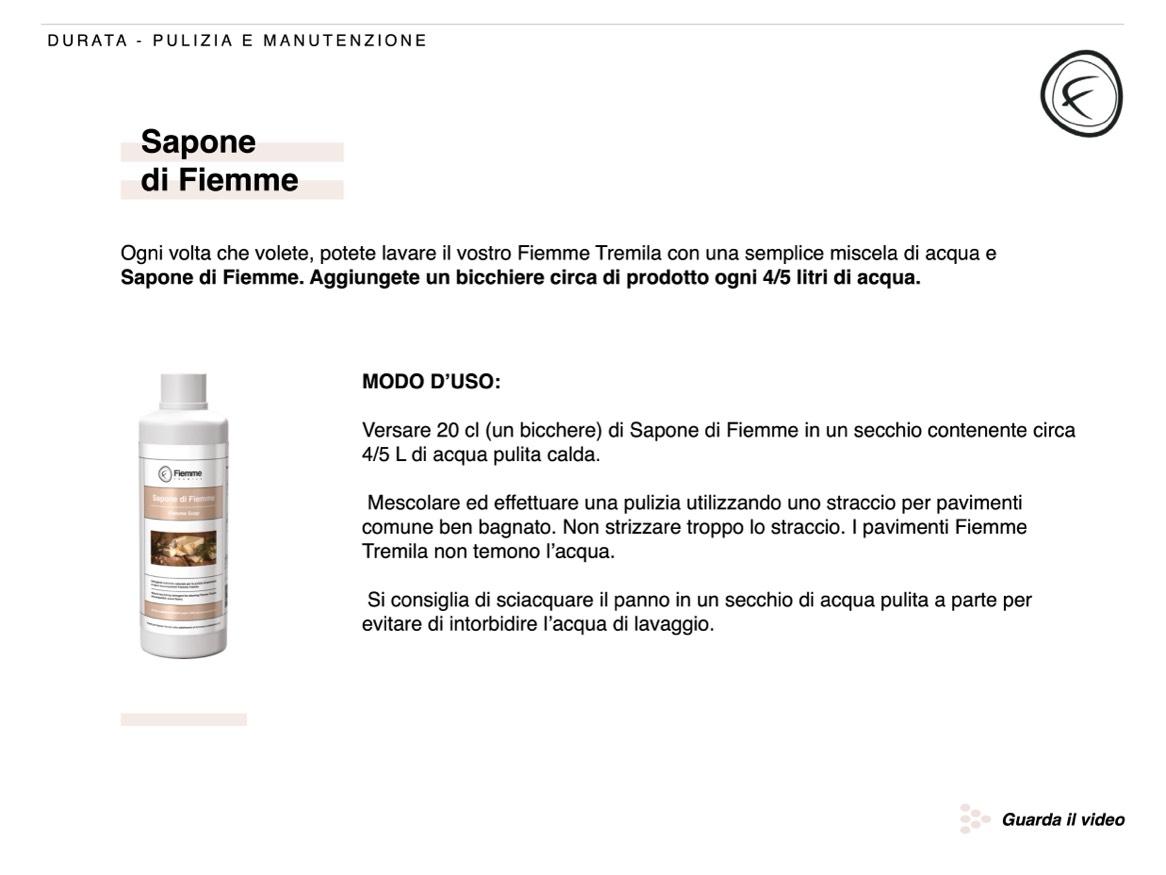 Sapone di Fiemme. Aggiungete un bicchiere circa di prodotto ogni 4/5 litri di acqua.