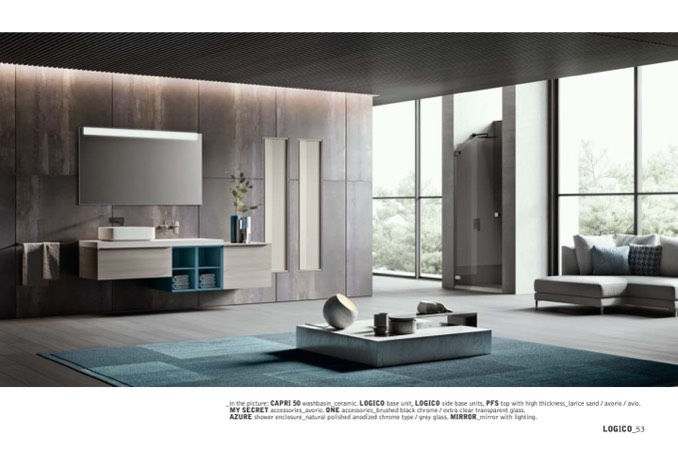_in the picture: CAPRI 50 washbasin_ceramic. LOGICO base unit, LOGICO side base units, PFS top with high thickness_larice sand / avorio / avio.