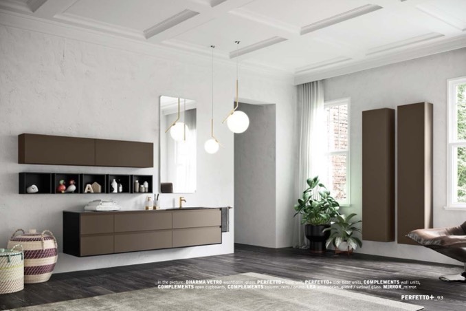 _in the picture: DHARMA VETRO washbasin_glass. PERFETTO+ base unit, PERFETTO+ side base units, COMPLEMENTS wall units,