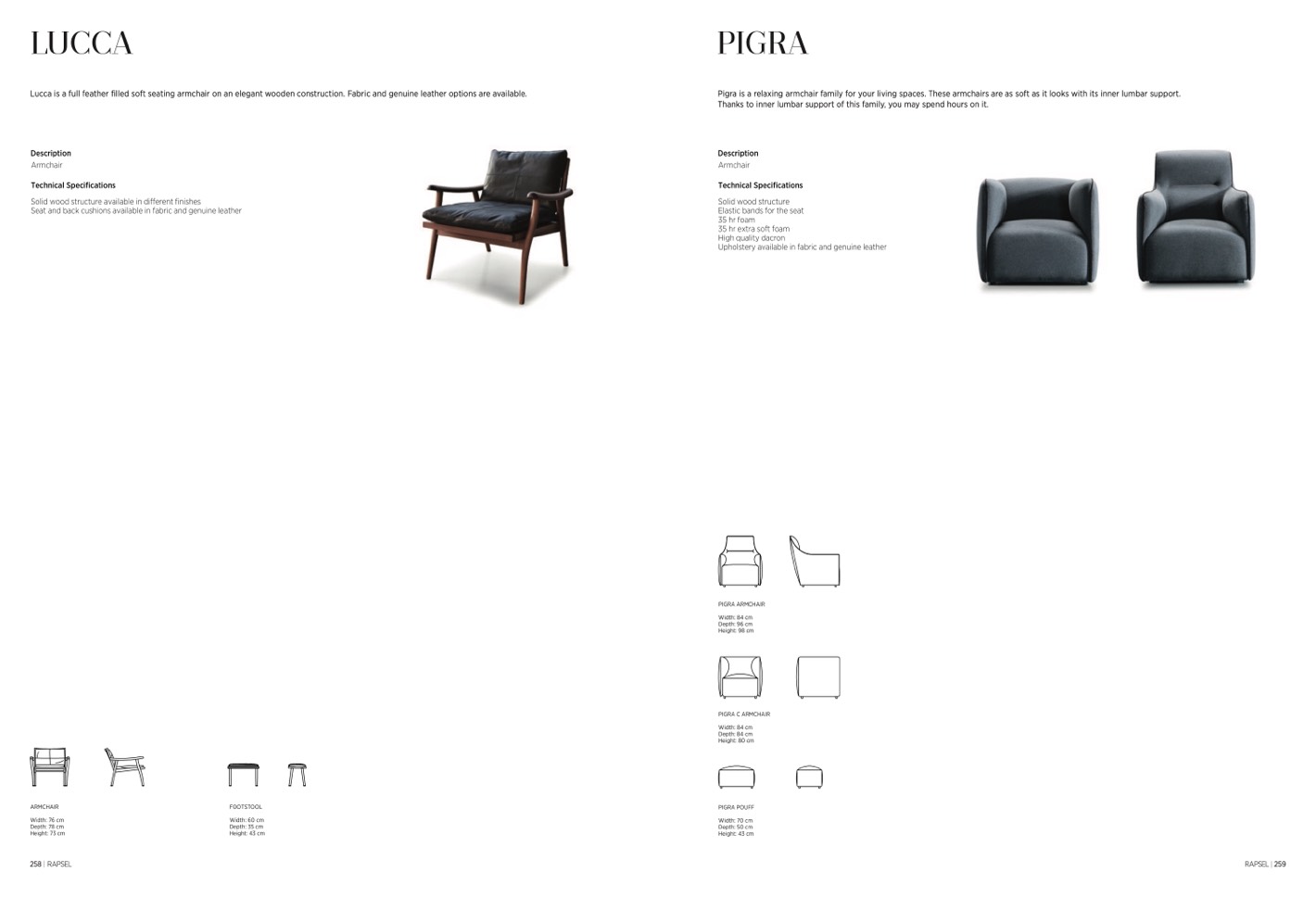 Lucca is a full feather filled soft seating armchair on an elegant wooden construction. Fabric and genuine leather options are available.