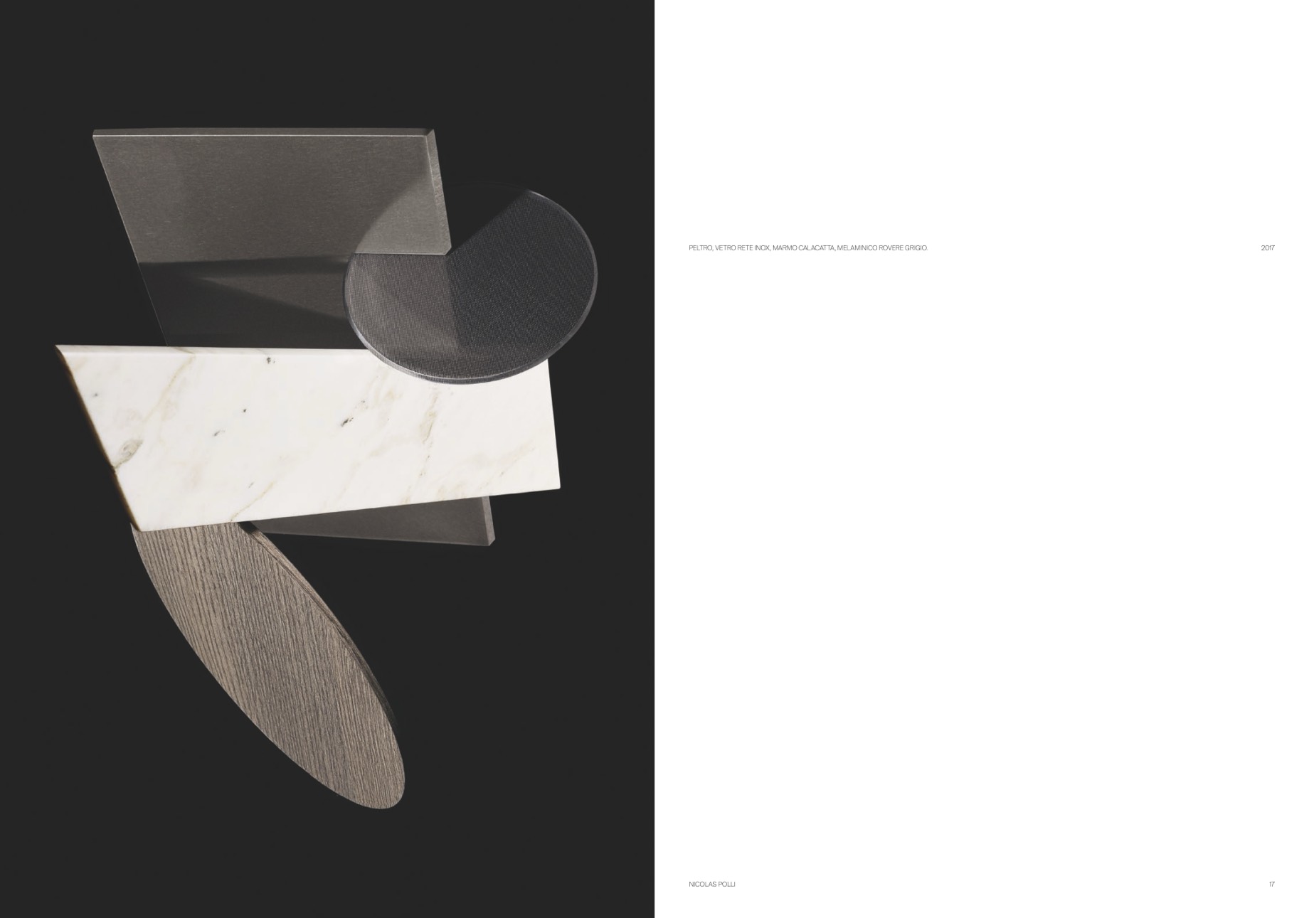 PELTRO, VETRO RETE INOX, MARMO CALACATTA, MELAMINICO ROVERE GRIGIO.
