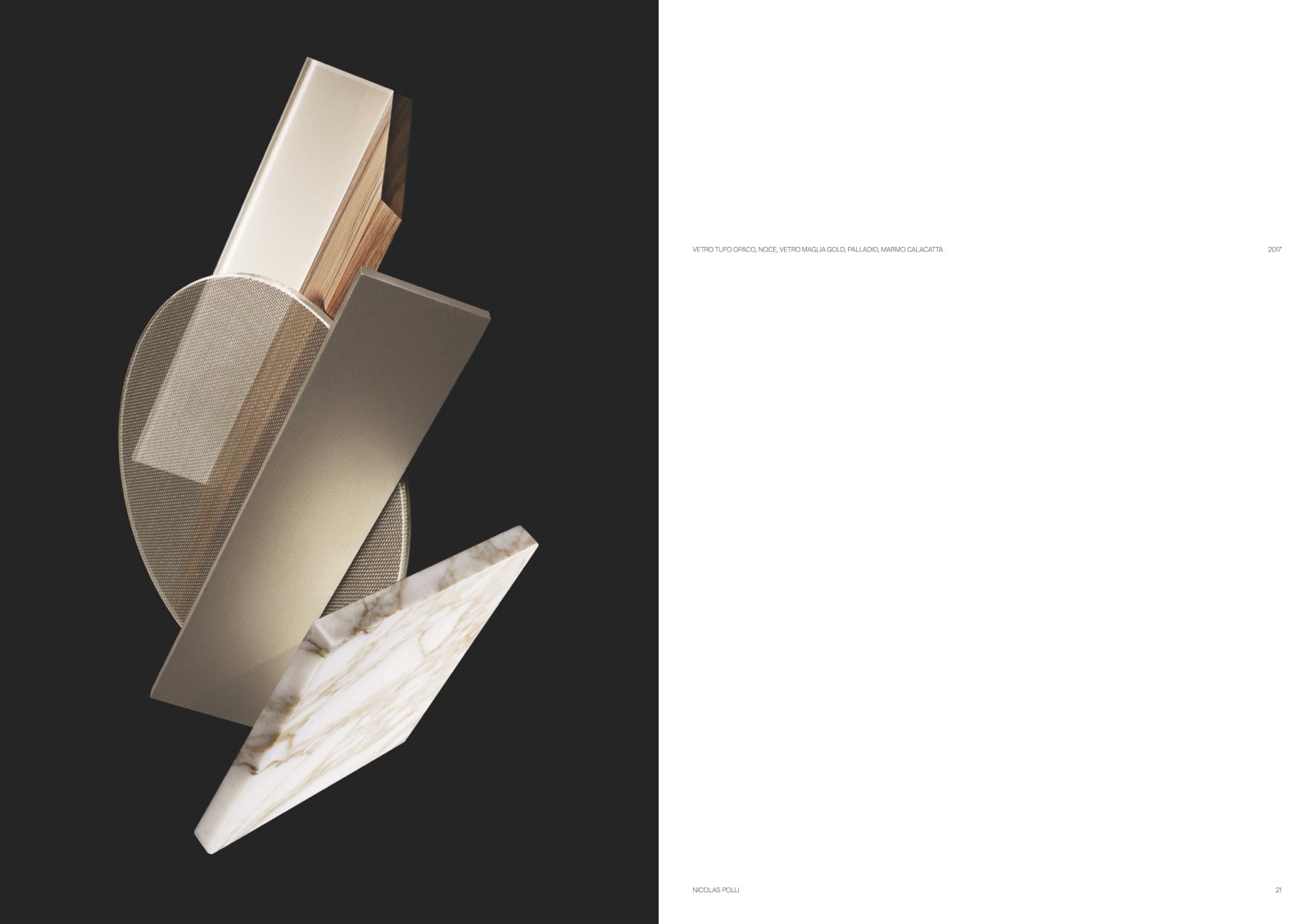 VETRO TUFO OPACO, NOCE, VETRO MAGLIA GOLD, PALLADIO, MARMO CALACATTA.