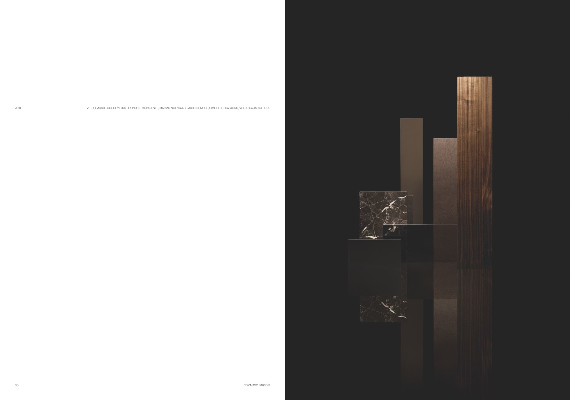 VETRO MORO LUCIDO, VETRO BRONZO TRASPARENTE, MARMO NOIR SAINT LAURENT, NOCE, SIMILPELLE CASTORO, VETRO CACAO REFLEX.