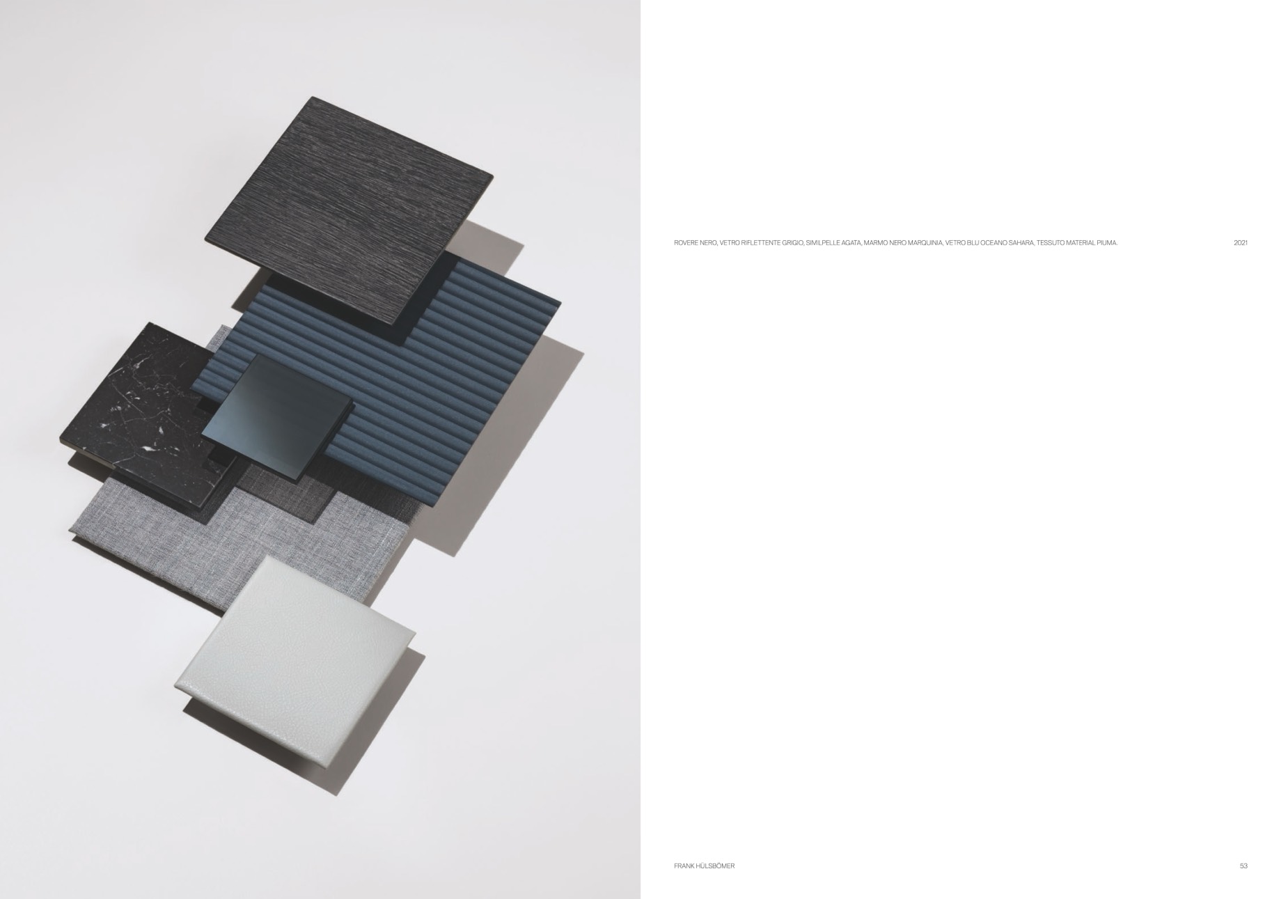 ROVERE NERO, VETRO RIFLETTENTE GRIGIO, SIMILPELLE AGATA, MARMO NERO MARQUINIA, VETRO BLU OCEANO SAHARA, TESSUTO MATERIAL PIUMA.