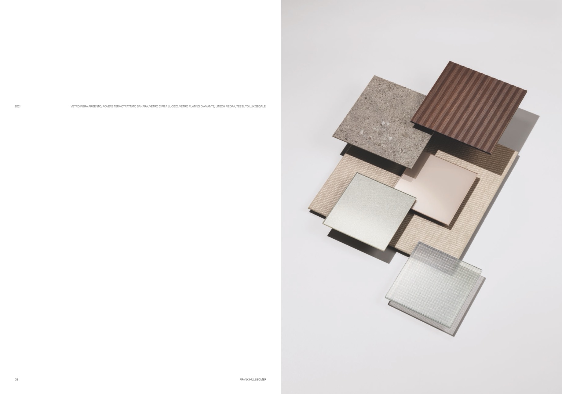 VETRO FIBRA ARGENTO, ROVERE TERMOTRATTATO SAHARA, VETRO CIPRIA LUCIDO, VETRO PLATINO DIAMANTE, LITECH PIEDRA, TESSUTO LUX SEGALE.