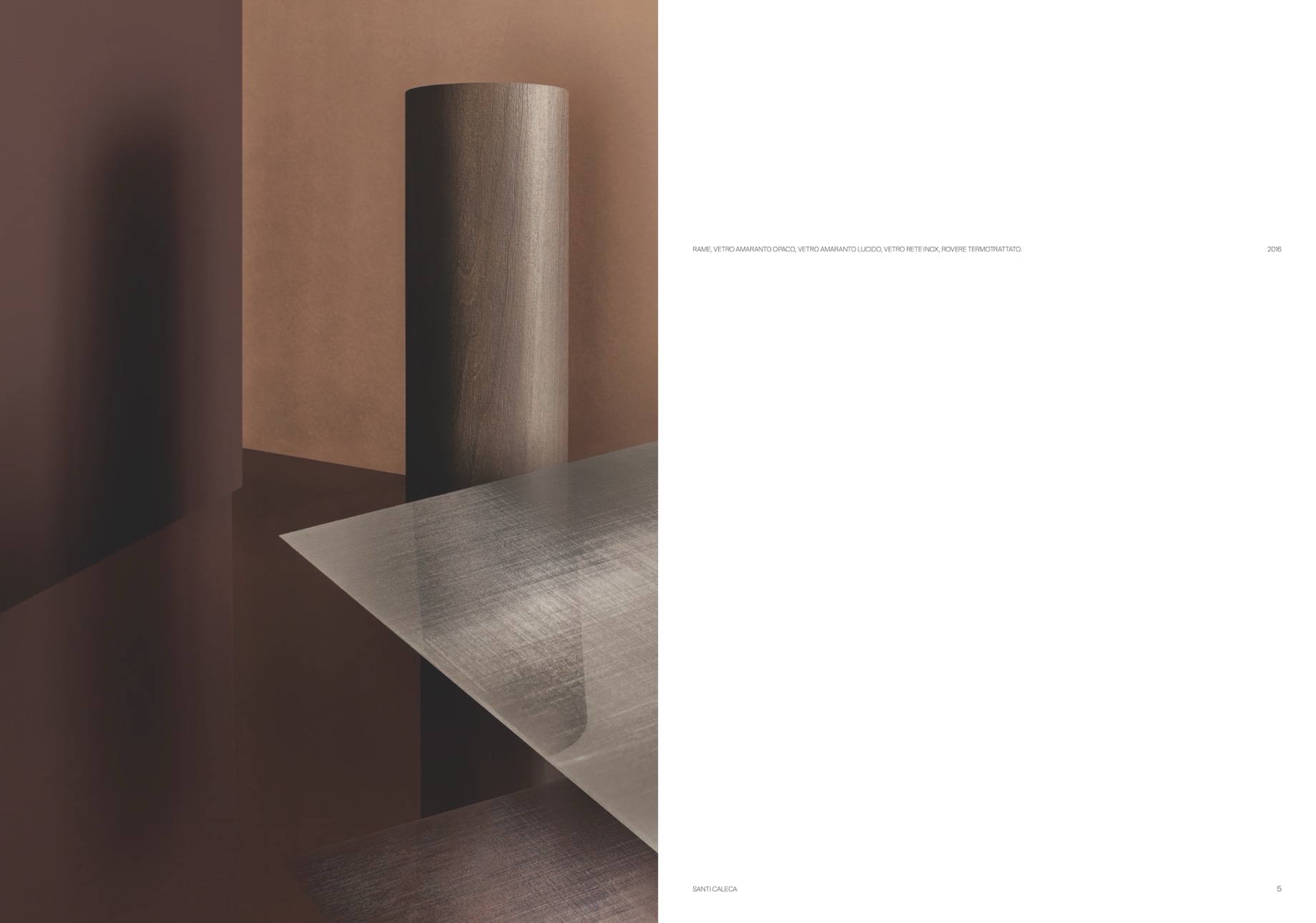 RAME, VETRO AMARANTO OPACO, VETRO AMARANTO LUCIDO, VETRO RETE INOX, ROVERE TERMOTRATTATO.