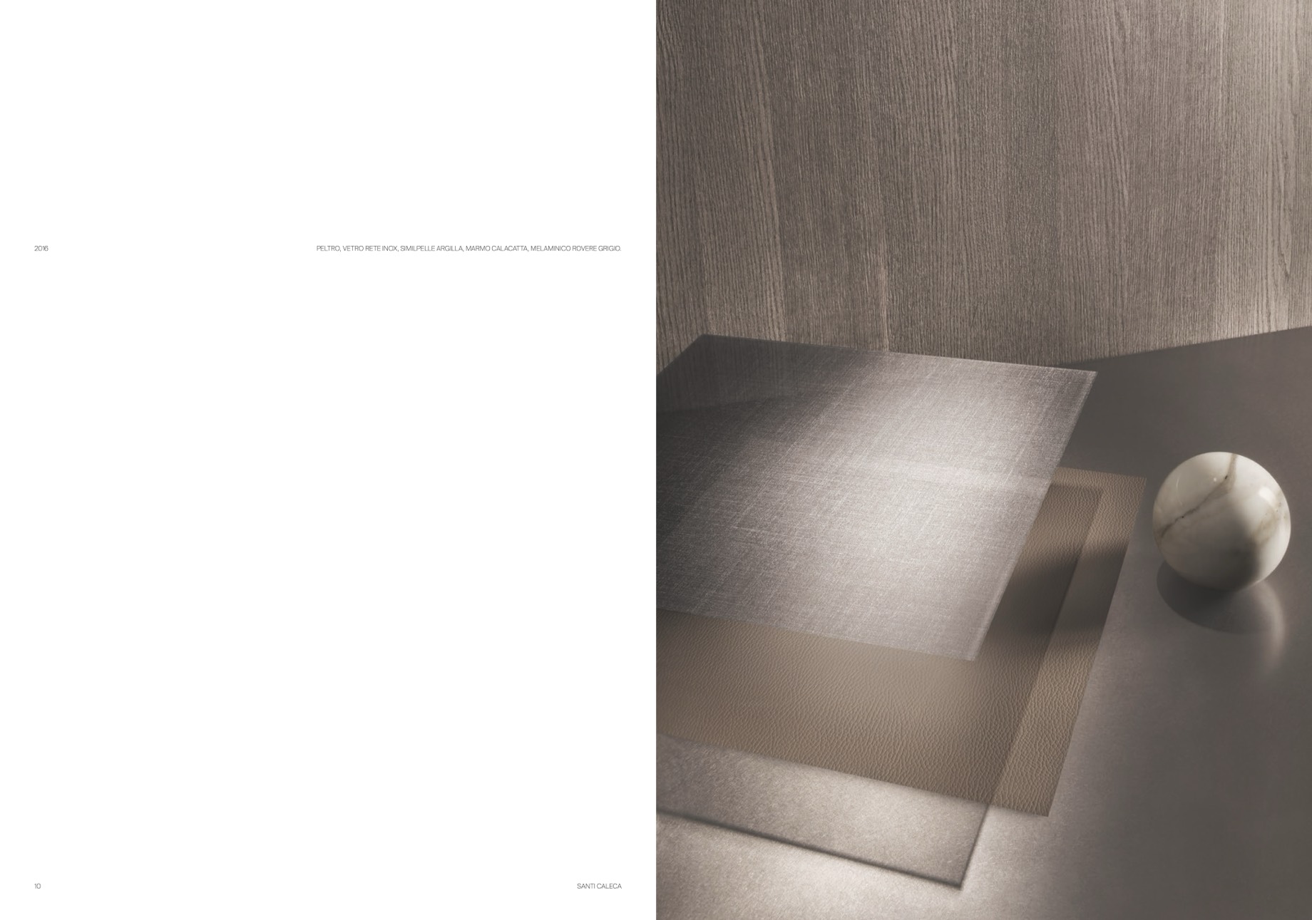 PELTRO, VETRO RETE INOX, SIMILPELLE ARGILLA, MARMO CALACATTA, MELAMINICO ROVERE GRIGIO.