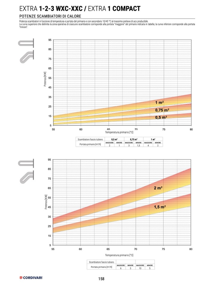 La curva superiore che delimita la zona operativa di ciascuno scambiatore corrisponde alla portata “maggiore” del primario indicata in tabella; la curva inferiore corrisponde alla portata