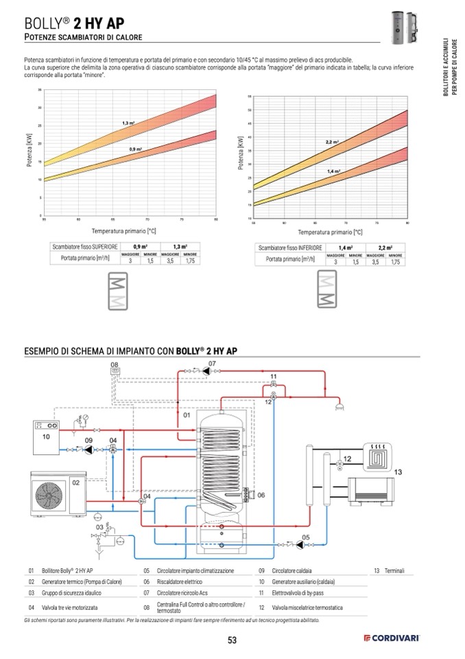 La curva superiore che delimita la zona operativa di ciascuno scambiatore corrisponde alla portata “maggiore” del primario indicata in tabella; la curva inferiore