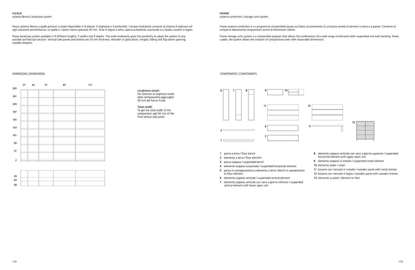 Flexus bookcase system available in 9 different heights, 5 widths and 3 depths. The wide modularity gives the possibility to adapt the system to any