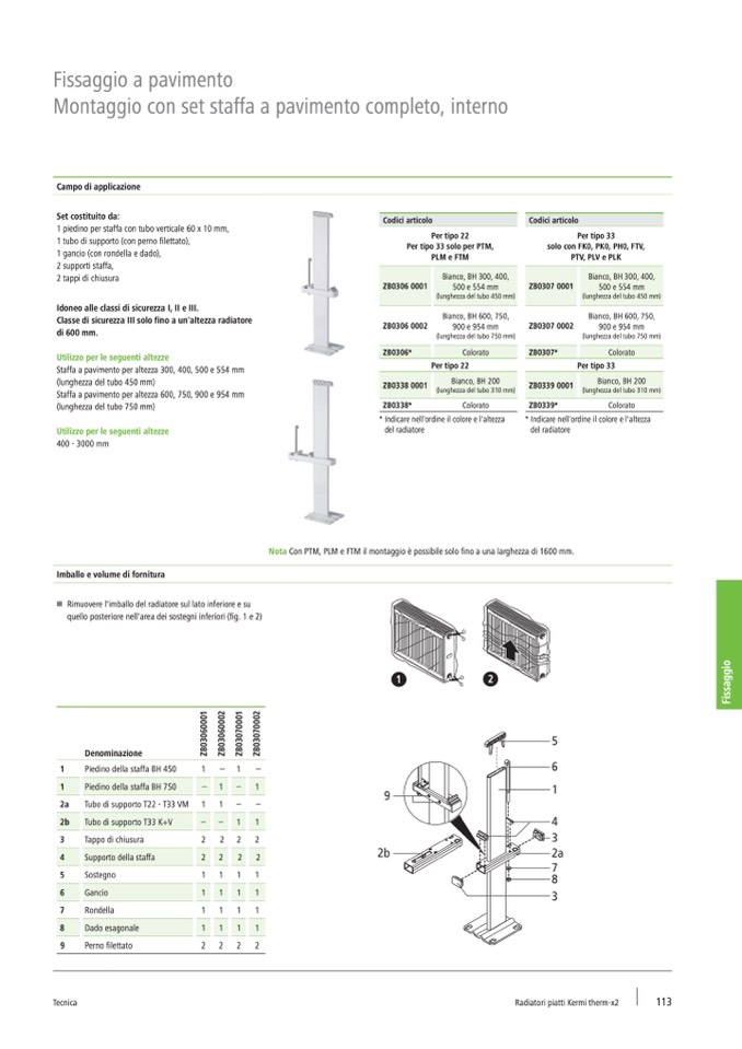 Staffa a pavimento per altezza 600, 750, 900 e 954 mm
