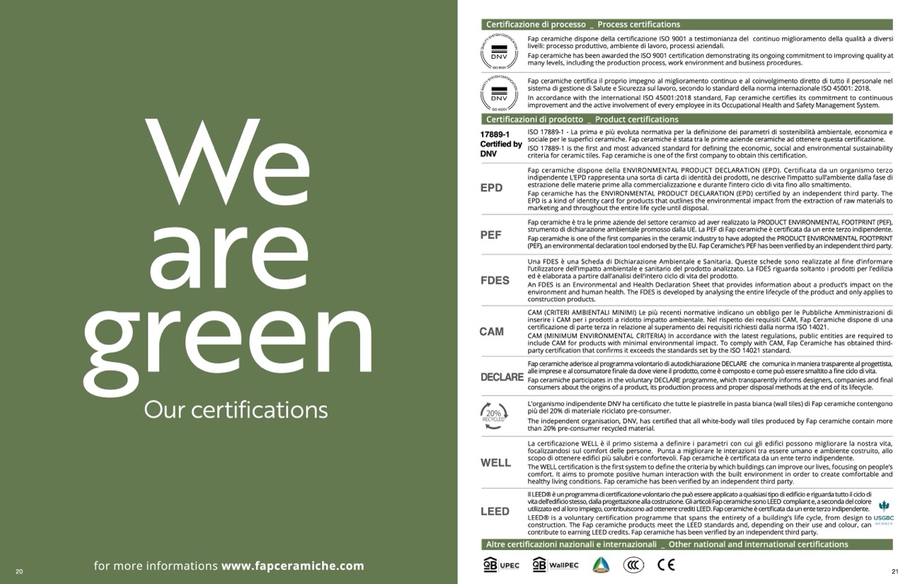criteria for ceramic tiles. Fap ceramiche is one of the first company to obtain this certification.