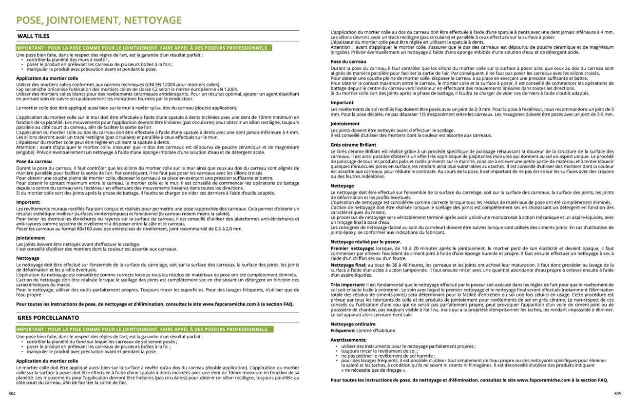 Pour toutes les instructions de pose, de nettoyage et d’élimination, consultez le site www.fapceramiche.com à la section FAQ.