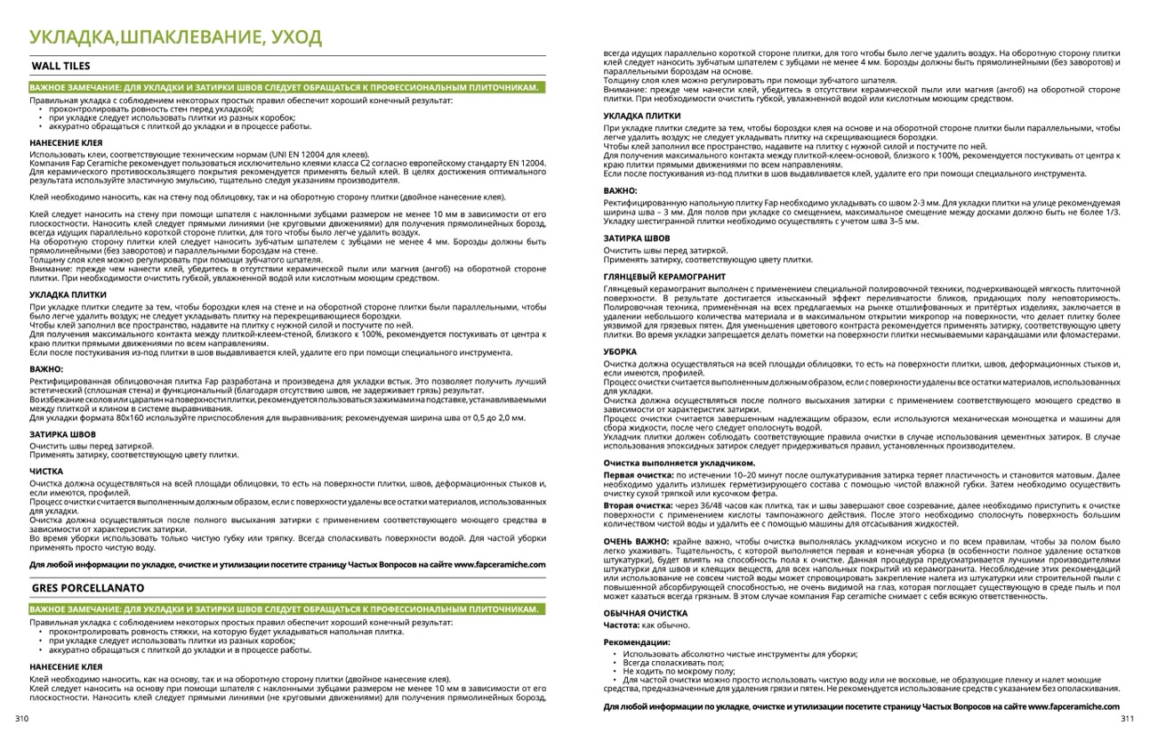 Для любой информации по укладке, очистке и утилизации посетите страницу Частых Вопросов на сайте www.fapceramiche.com