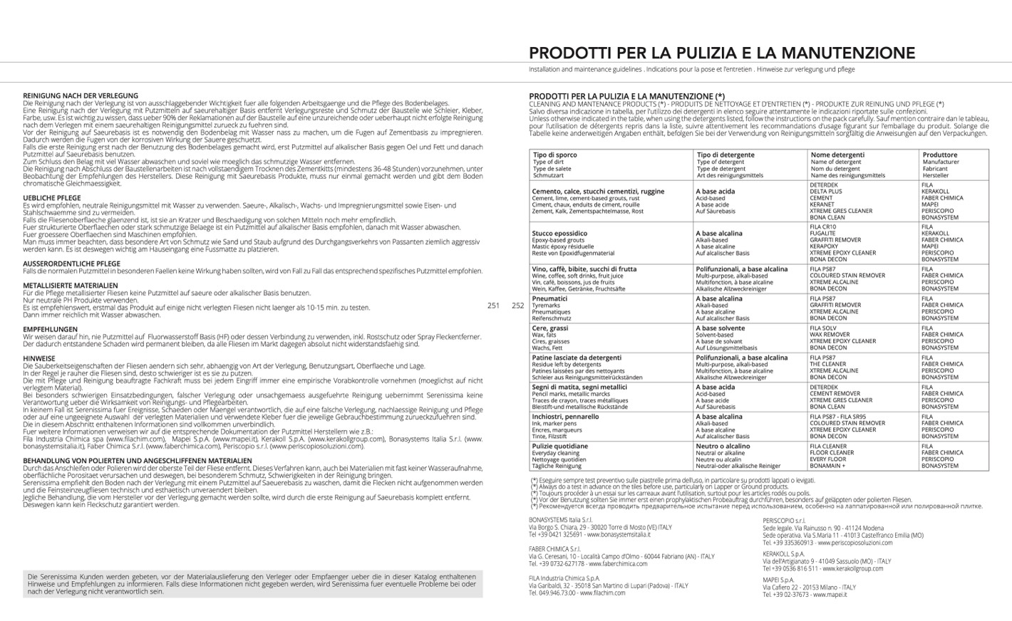 In keinem Fall ist Serenissima fuer Ereignisse, Schaeden oder Maengel verantwortlich, die auf eine falsche Verlegung, nachlaessige Reinigung und Pflege