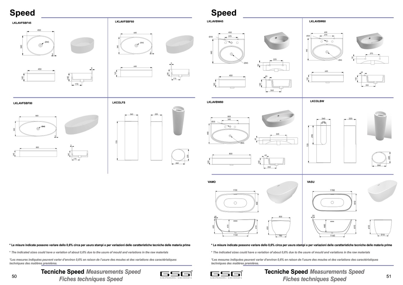 * Le misure indicate possono variare dello 0,6% circa per usura stampi e per variazioni delle caratteristiche tecniche delle materia prime
