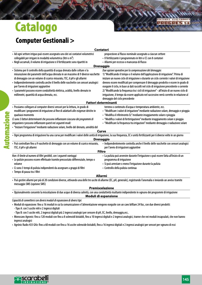 • Monocavo Agronic: fino a 120 moduli con fino a 8 solenoidi bistabili, fino a 10 ingressi digitali e 2 ingressi analogici, tranne che nei moduli incapsulati, che non hanno