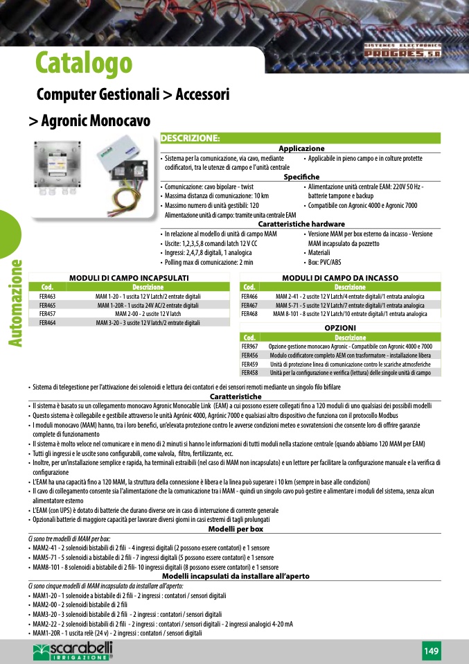 • Il sistema è basato su un collegamento monocavo Agronic Monocable Link (EAM) a cui possono essere collegati fino a 120 moduli di uno qualsiasi dei possibili modelli