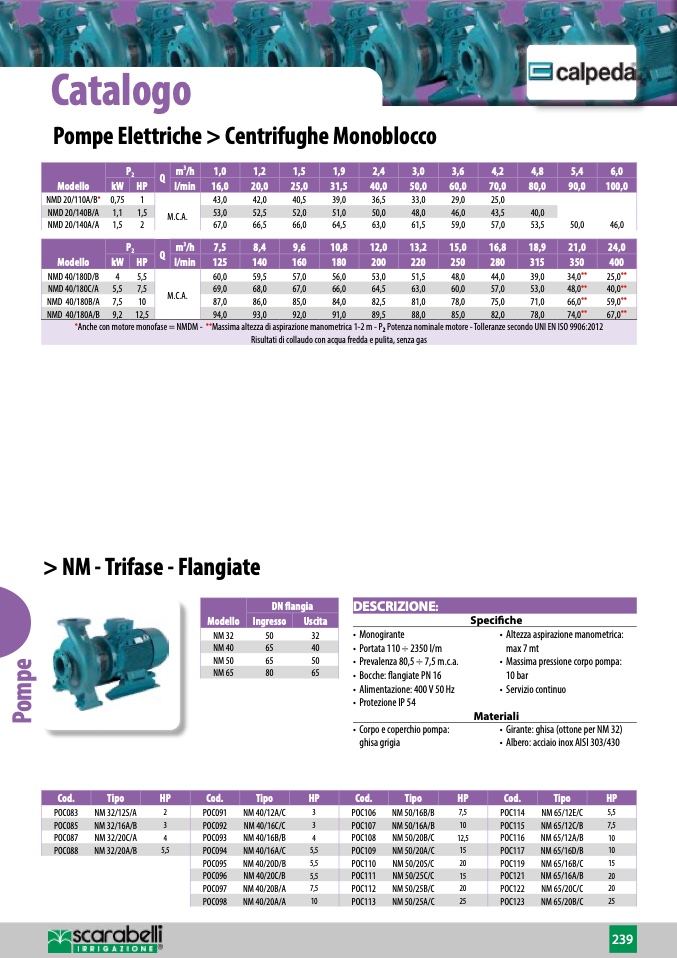 •Anche con motore monofase = NMDM - ••Massima altezza di aspirazione manometrica 1-2 m - P