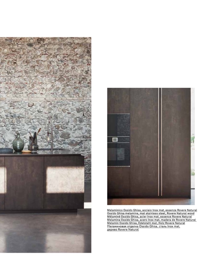 Melamina Ossido Ghisa, acero Inox mat, madera de Rovere Natural