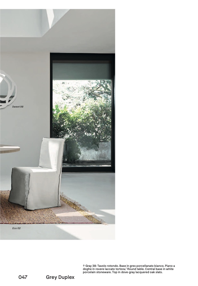 ↑ Gray 38: Tavolo rotondo. Base in gres porcellanato bianco. Piano a