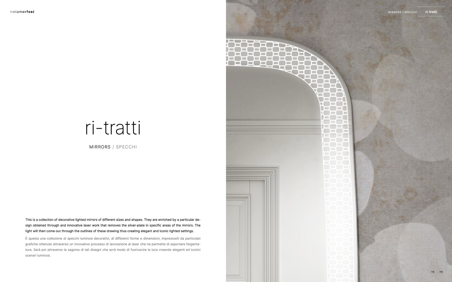 È questa una collezione di specchi luminosi decorativi, di differenti forme e dimensioni, impreziositi da particolari