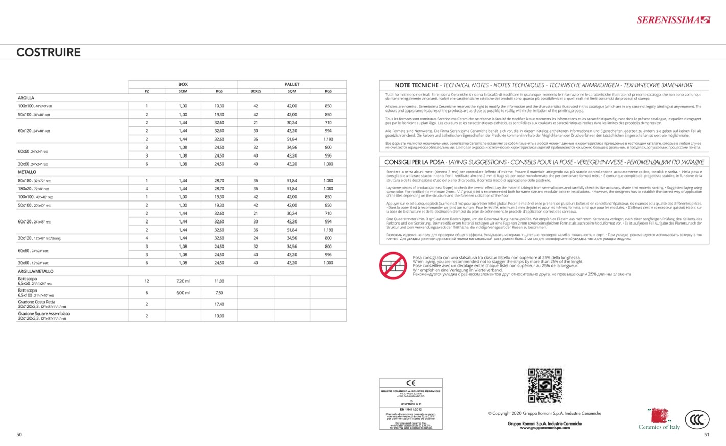 Все форматы являются номинальными. Serenissima Ceramiche оставляет за собой пзменять в любой момент данные и характеристики, приведеные в настоящем каталоге, которые в любом случае