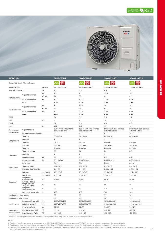 2. Condizioni in riscaldamento: temperatura interna 20°C (DB), 15°C (WB); temperatura esterna 7°C (DB) lunghezza tubazioni equivalente 5m senza dislivello.