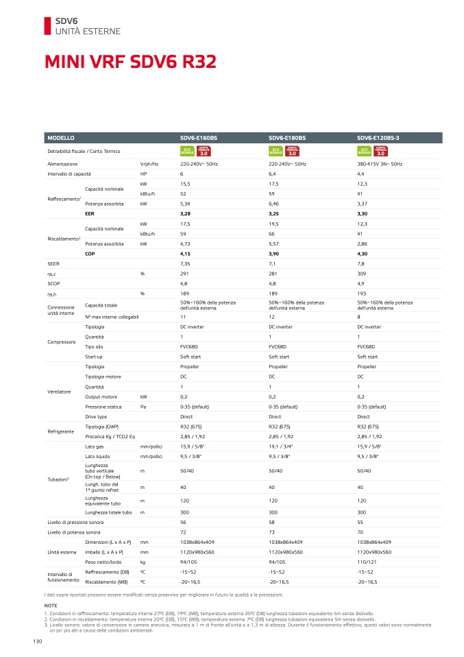 2. Condizioni in riscaldamento: temperatura interna 20°C (DB), 15°C (WB); temperatura esterna 7°C (DB) lunghezza tubazioni equivalente 5m senza dislivello