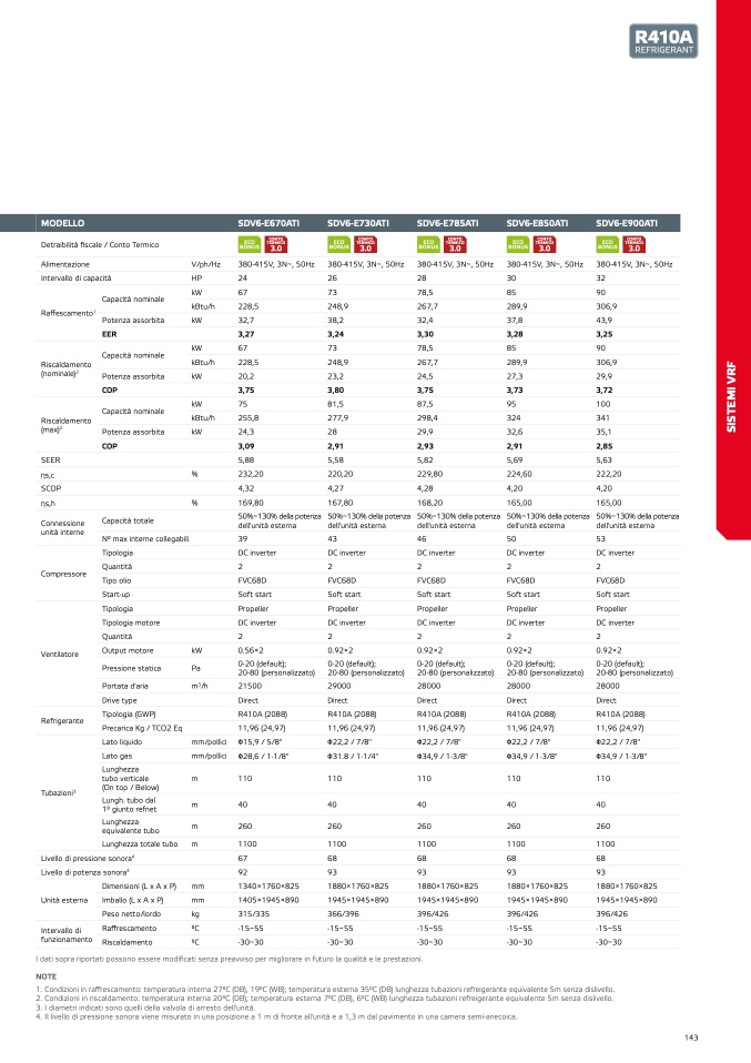 1. Condizioni in raffrescamento: temperatura interna 27°C (DB), 19°C (WB); temperatura esterna 35°C (DB) lunghezza tubazioni refreigerante equivalente 5m senza dislivello.