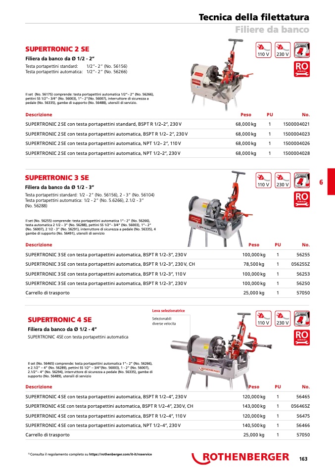 2.1/2”– 4” (No. 56294), interruttore di sicurezza a pedale (No. 56335), gambe di