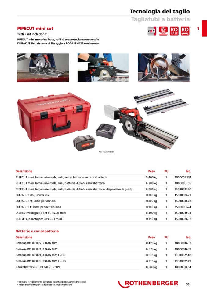PIPECUT mini, lama universale, rulli, batteria 4.0 Ah, caricabatteria