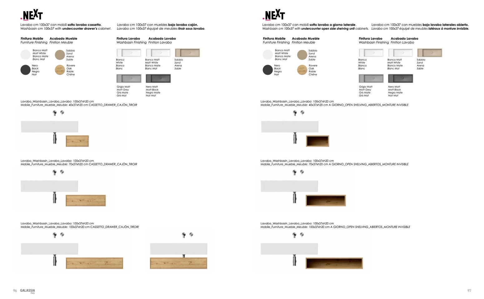 Washbasin cm 100x37 with undercounter open side shelving unit cabinets. Lavabo cm 100x37 équipé de meubles latéraux à monture invisible.
