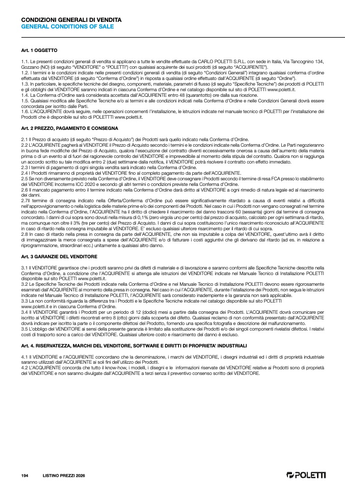e gli obblighi del VENDITORE saranno indicati in ciascuna Conferma d’Ordine e nel catalogo disponibile sul sito di POLETTI www.poletti.it.